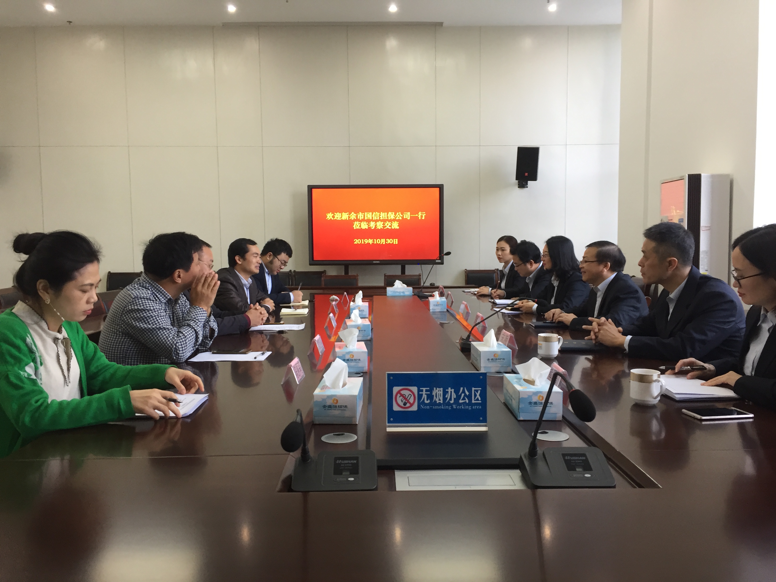 2019年10月30日上午,新余市国信担保有限公司副总经理钟秋生携财务总监、财务经理、业务经理等一行6人前来公司考察,公司副总经理刘传芬、赖旭辉等接待了来访客人。双方就对接国家融资担保基金后业务拓展、资产比例管理、绩效考核及容错纠错机制、企业党建等方面进行了交流,座谈会气氛热烈,双方共同分享所做所想,进行了一场头脑风暴,得到了有益的启发 。